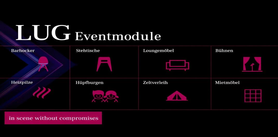 Die Lighting UG Eventmodule ermöglichen eine schnelle Buchung und Lieferung Ihrer Mietmodule. Wir bieten zudem auch viele Möbel und Artikel zum Kauf an. Wir liefern Ihnen deutschlandweit Leihmodule wie Barhocker, Stehtische, Echtleder-Loungemöbel, Bühnen, Heizpilze, Hüpfburgen, Zelte und andere Mietmöbel.